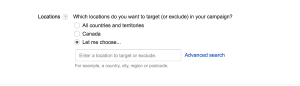 تصمیم گیری گنید که منطقه جغرافیایی که شما می خواهید هدف قرار دهید چقدر بزرگ یا کوچک باشد. شما می توانید کل کشور را انتخاب کنید، مناطق از کشورها، دولت و یا استان، شهرستانها و حتی مجلس شورای اسلامی! شما همچنین می توانید مناطق جغرافیایی سفارشی تعیین شده، مانند مختصات طول و عرض جغرافیایی و یا شعاع مجموعه ای از تعداد مایل یا کیلومتر در اطراف یک آدرس خاص را انتخاب نمایید. گزینه “Let me choose …” را کلیک کنید و سپس منطقه مناسب برای شما جستجو کنید. در واقع اگر می خواهید مناطق ایران را انتخاب کنید از متاسفانه به دلیل تحریمهای گوگل ادوردز، نام کشور گوگل در لیست نشان داده نمیشود. بنابراین برای ایران تنها می بایستی از روش دوم استفاده کنید.