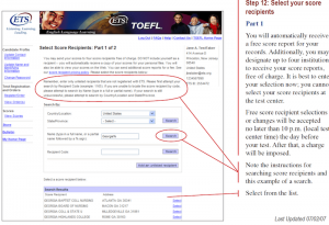 بخش 1 بطور خودکار، یک گزارش رایگان از نمره خود را دریافت خواهید کرد. همچنین میتوانید چهار موسسه را تعیین کنید که بصورت رایگان گزارش نمره شما را دریافت کنند. بهتر است تا انتخاب خود را در همین مرحله انجام دهید؛ شما قادر نخواهید بود تا دریافت کنندگان گزارش نمره شما را در مرکز آزمون انتخاب کنید. انتخاب و یا تغییر در دریافت کنندگان گزارش نمره فقط تا ساعت 10 بعد از ظهر روز قبل از آزمون قابل قبول است. انجام این عمل پس از آن شامل پرداخت هزینه اضافی خواهد بود.